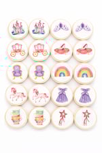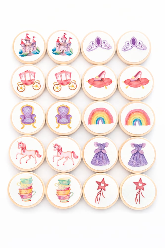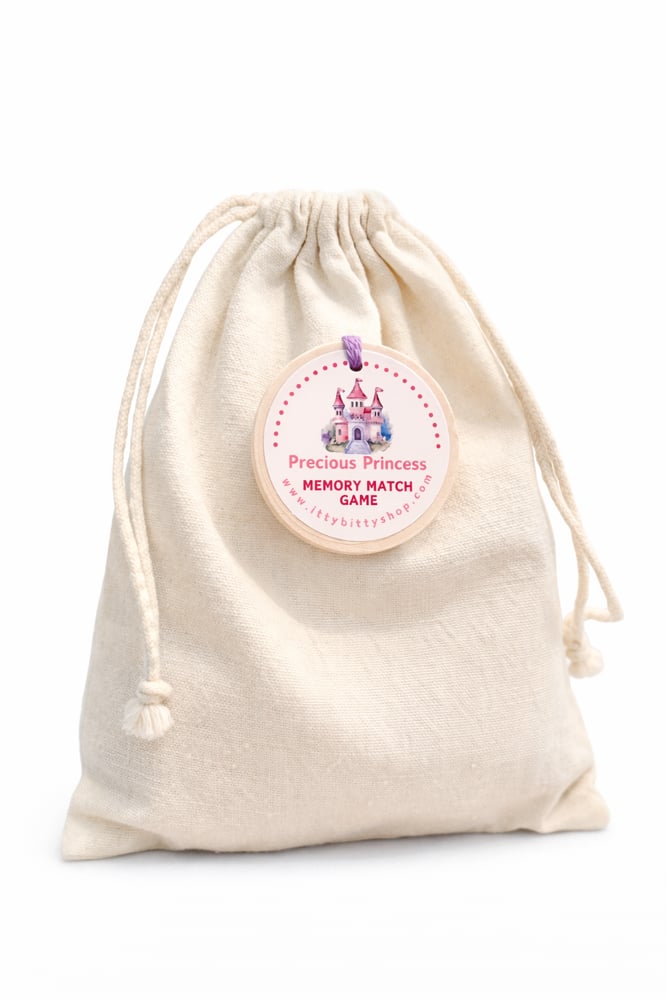 This princess-themed memory match game is made up of ten pair of double-sided 2" wood coins and conveniently held in a drawstring bag.