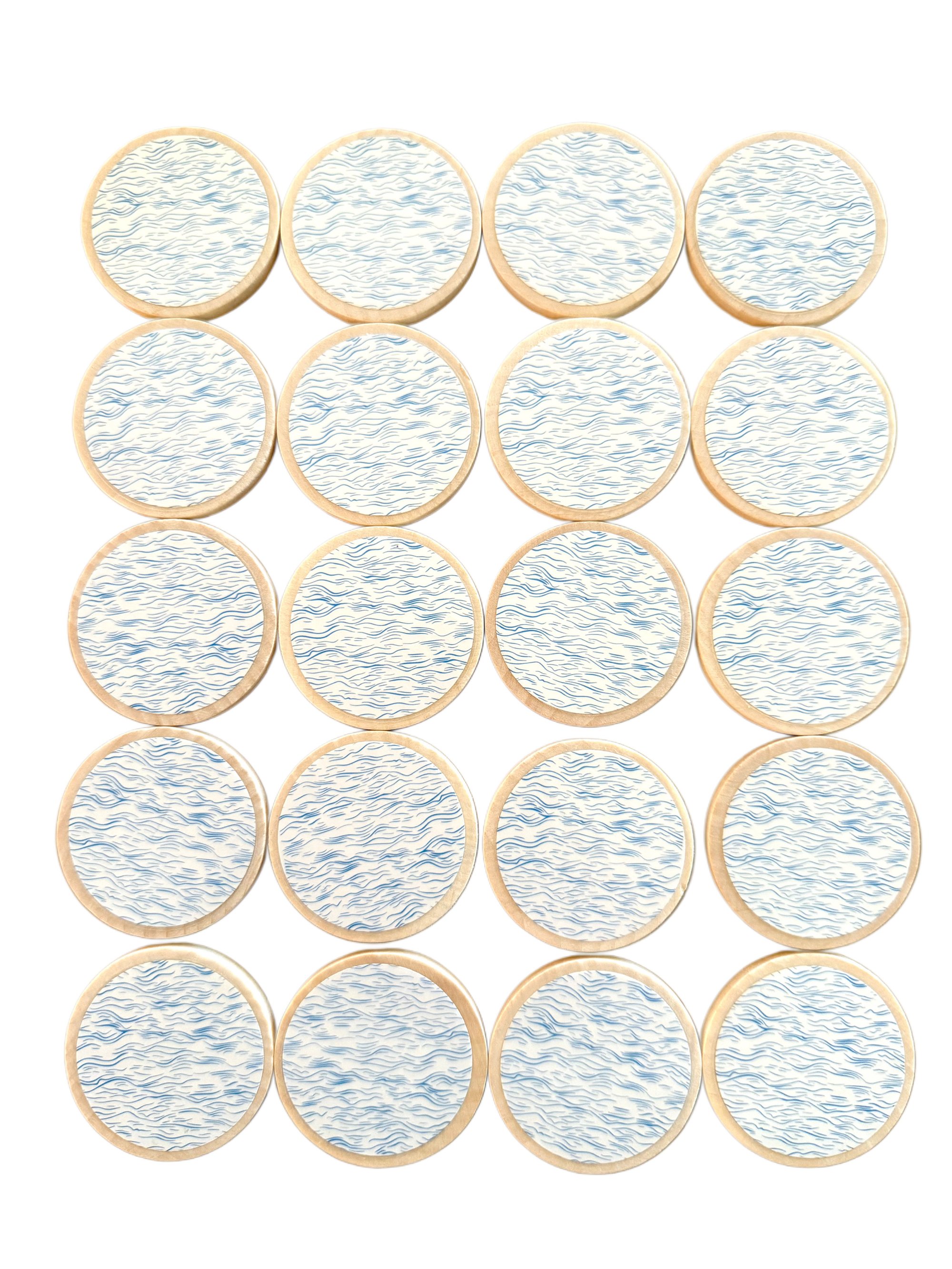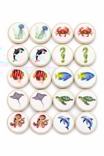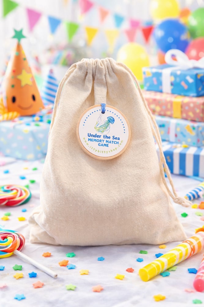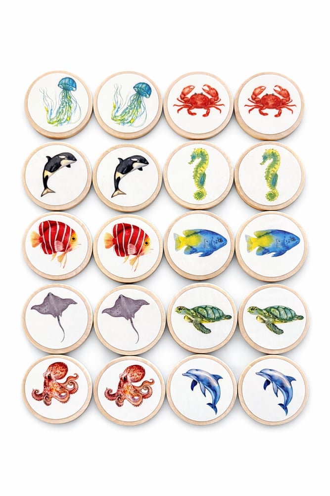 This sea-themed memory match game is made up of ten pair of double-sided 2" wood coins and conveniently held in a drawstring bag.