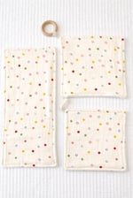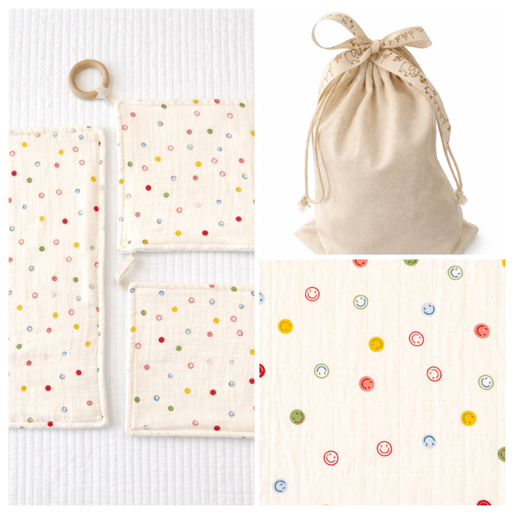Each piece in this bundle is made of a super-soft, absorbent microfiber on one side and the other side a most adorable muslin fabric by Mushie (100% cotton). The lovey teether boasts a natural wood teething ring. Info card included.