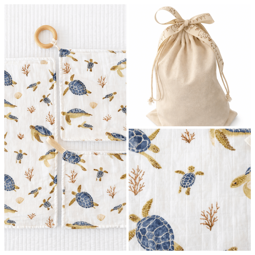 Each piece in this bundle is made of a super-soft, absorbent microfiber on one side and the other side a most adorable muslin fabric by Lifetree (70% viscose from bamboo, 30% cotton). The lovey teether boasts a natural wood teething ring. Info card included.